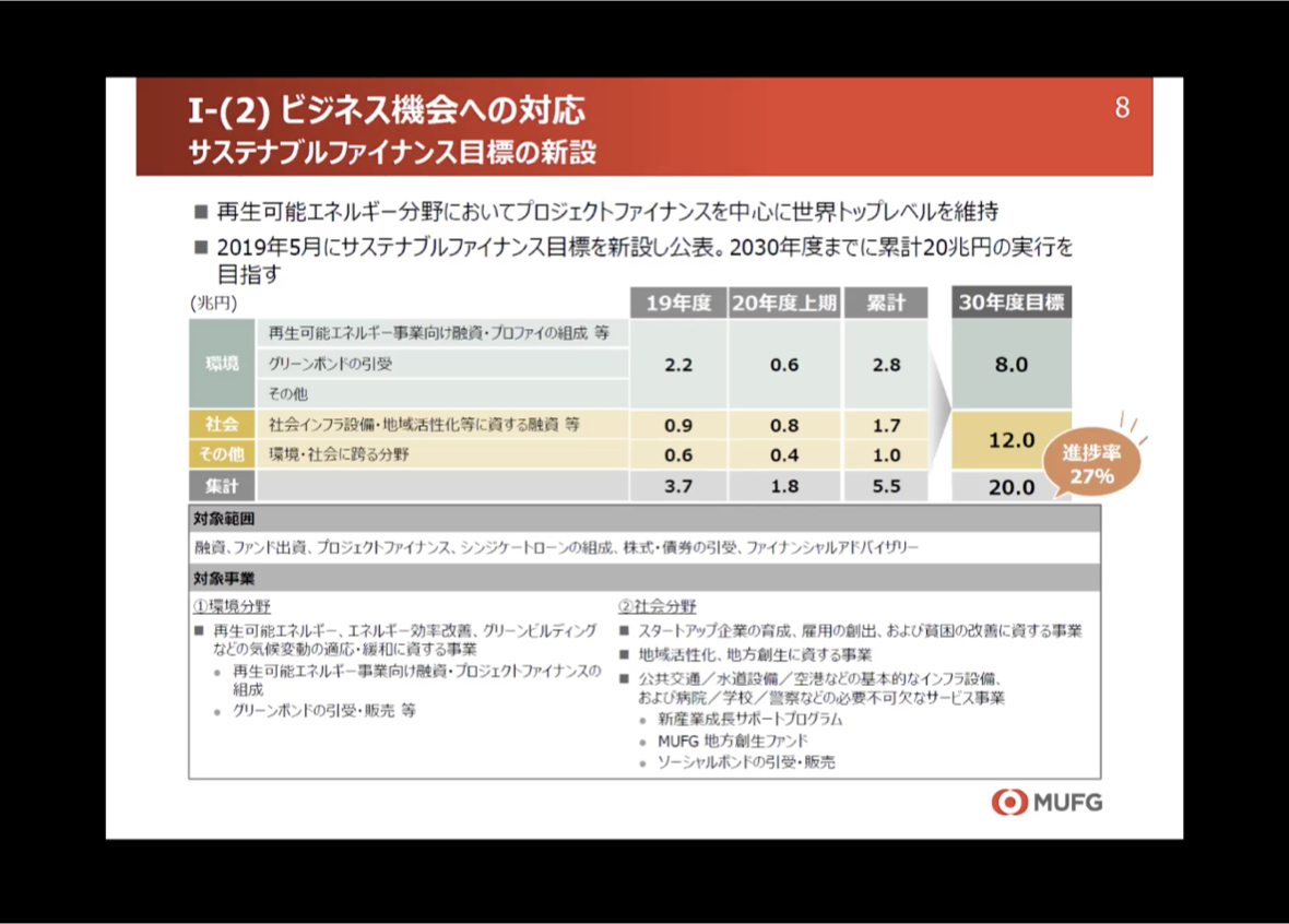 最初に登場したのは、ESGファイナンスの組成で日本初や世界初の事例をいくつも手掛けてきたMUFGグループ(以下MUFG)の、三菱UFJ銀行(以下銀行)のソリューションプロダクツ部サステナブルビジネス室次長の緒方雄一氏です。最初に緒方氏は、同社のサステナビリティへの取り組みについて説明しました。