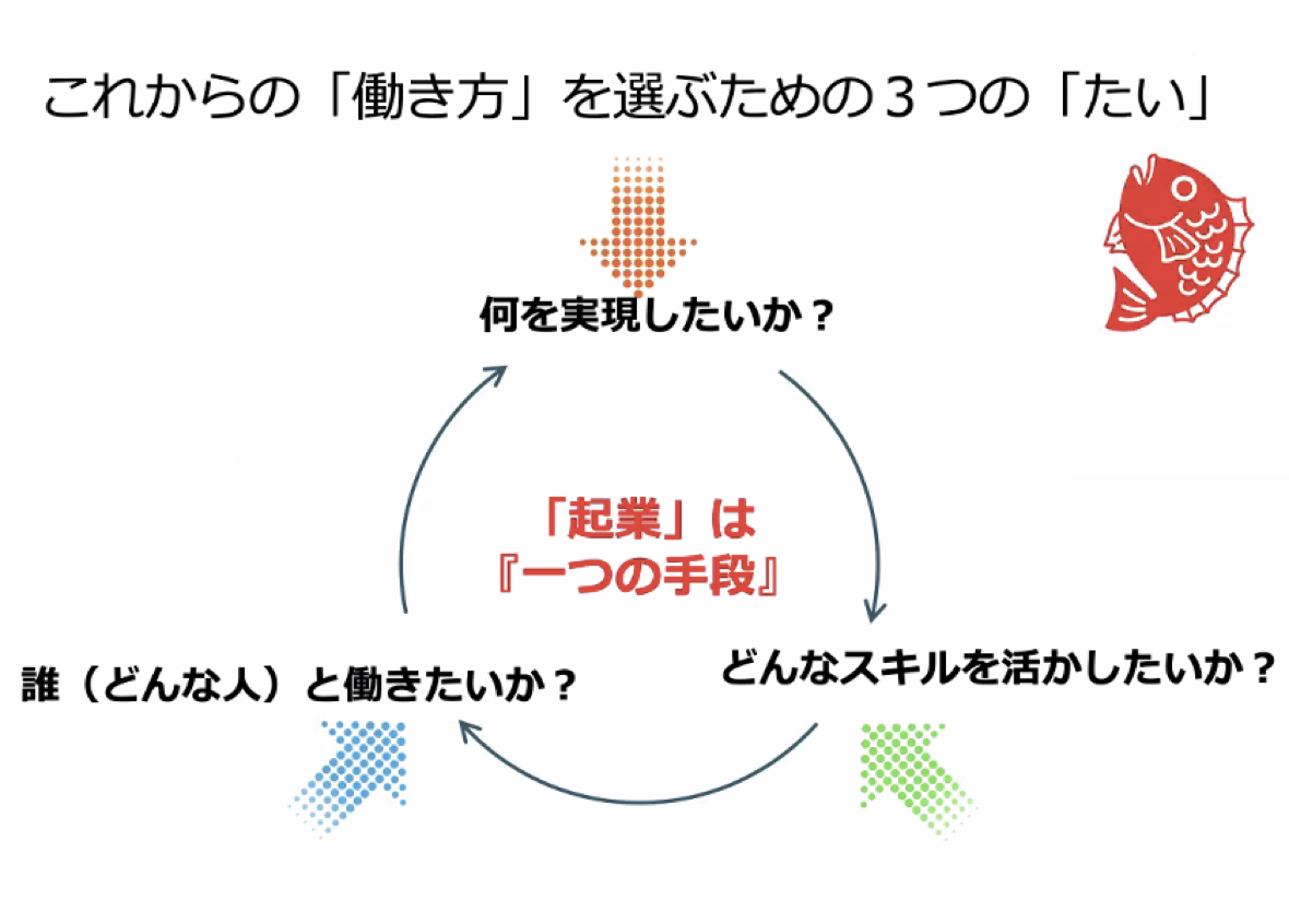 「3つの"たい"はつまり"want"を意味しています。ですから、欲望を実現するための手段として起業という選択肢があると考えた方がいいと思います。そういう考えを持っておくと起業のハードルも下がりますし、具体的なアイデアも持てるはずなので、この3つのポイントについて自分がどう考えているかを振り返ってみてもらいたいと思います」