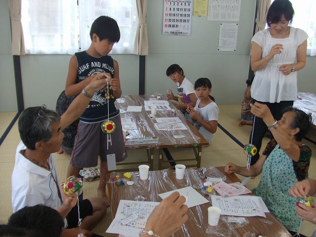 プログラムの内容は、皆さんに仮設住宅で涼しげに過してもらおうと、チリーン♪チリーン♪と優しい音色を奏でるふうりん♪を作ってもらいました。このふうりんは、透明容器に粘土で絵を描くように盛りつけて、自分流のふうりんを作ってみよう!と言う企画です。