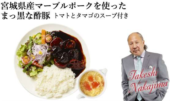 27日からの第2週は「際コーポレーション」オーナー中島武氏の中華プレート。際オリジナルの、黒酢と中国醤油を使った、深みのある独特な味わいのまっ黒な酢豚は、あっさりとしたマーブルポークを歯ごたえの楽しい肉団子仕立てで。このパンチの効いた酢豚に、お米だけでも食べてもらいたいと中島氏が絶賛したふゆみずたんぼ米を合わせて。「日本人は食が細すぎる!食べて食べて食べまくらないと!」と中島氏のコメントどおり、ボリュームのある一皿です。