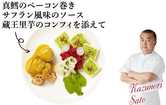 「レストラン・シェ・パパ」オーナーシェフ佐藤和則氏は、この時期味がのる三陸産の真鱈をサフランとドライトマトでアクセントをつけたクリーム系のソースで。蔵王の里芋は地元でも希少だそうですよ。
