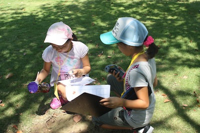 アスファルト、土、木陰...などそれぞれ放射温度計を手にして、思い思いのポイントを探して測定しました。うだるような暑さのなか、さすが子どもたち、元気です!!