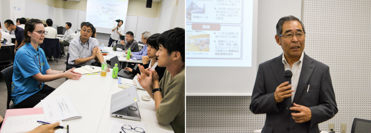 グループディスカッションの様子(左)。上士幌町長・竹中貢氏(右)。