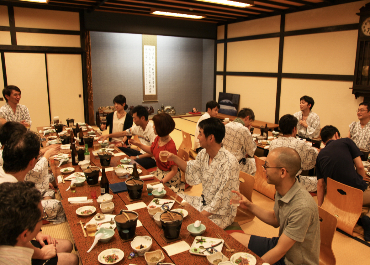 夕方、中村屋に戻った一行は、しばしそれぞれの時間を過ごしたあと、再びお座敷に集合しました。温泉に入り、浴衣に着替えてきた人が半数以上というくつろいだ雰囲気の中、2日目の懇親会が行われました。地元料理に舌鼓を打ちながら、賑やかなひとときが共有されました。一部の受講生の間では、2次会も開かれたのだとか。バイタリティに溢れる面々が顔を揃えた今回のフィールドワークも、いよいよ終盤。最終日はいよいよビジネスプランの発表です。