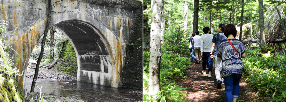 1955年に完成した橋長7mの小さなアーチ橋「五の沢橋梁」(左)。豊かな緑に囲まれた旧国鉄士幌線路跡を散策する受講生たち(右)。線路跡を歩く前と後とでは、森林浴によってストレス度が改善されることが、北海道大学医学部と上士幌町の連携研究によって証明されている。