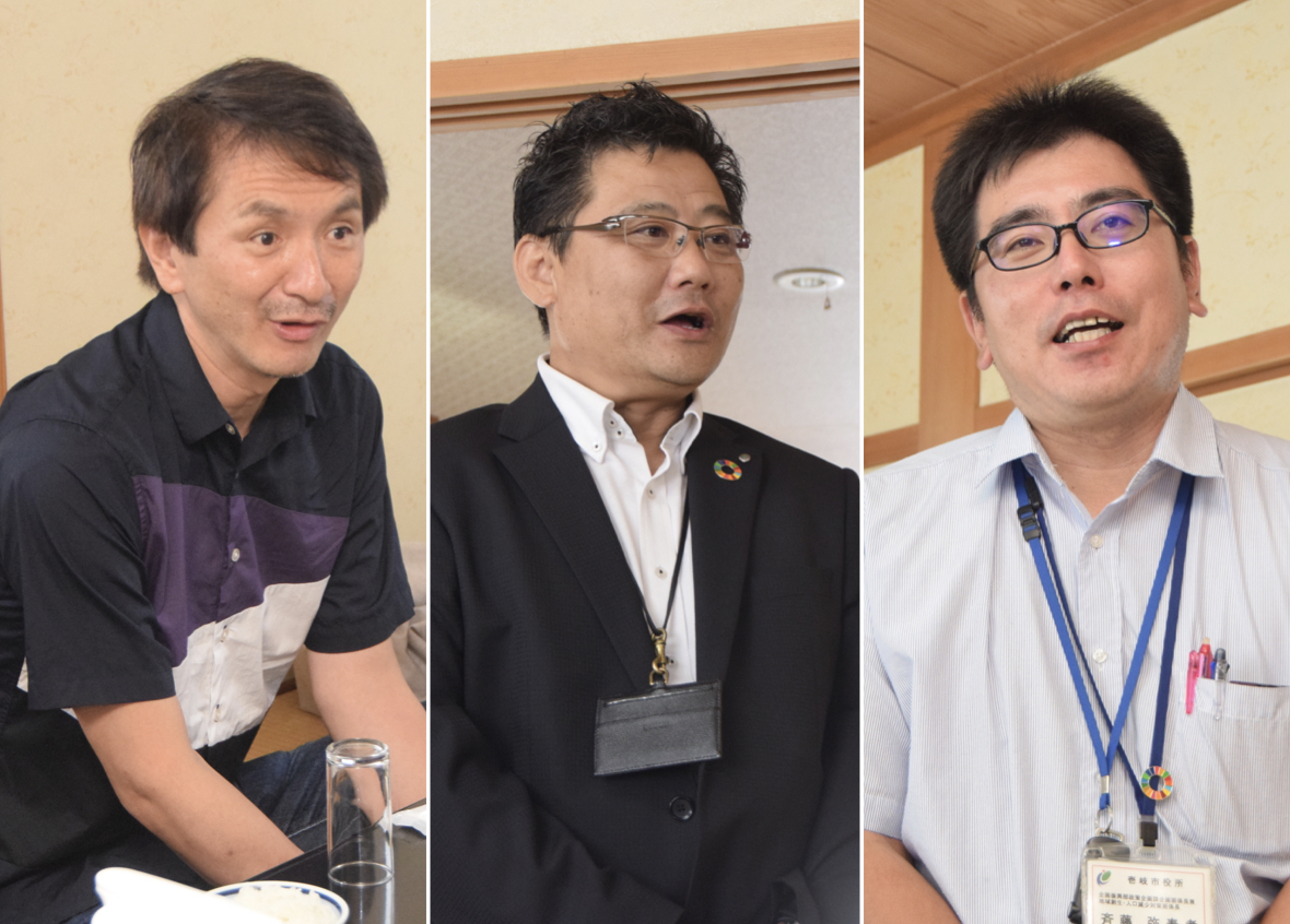 逆参勤交代の提唱者である松田智生氏(写真左)、3日間に渡って参加者をアテンドする壱岐市役所 企画振興部 政策企画課 課長の平田英貴氏(写真中央)と同係長の斉藤弥寿孝氏。