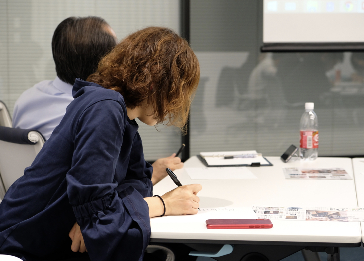 ここまでの講義をもとに、机の上に置かれた白紙とペンでゴールデンサークルについて書き込むワークが始まります。今回は、パラレルキャリアについて、「Why」「How」「What」の3点を明らかにし、実行計画を立てていきます。講義の緊張感とはまた違う、真剣な空気が漂います。