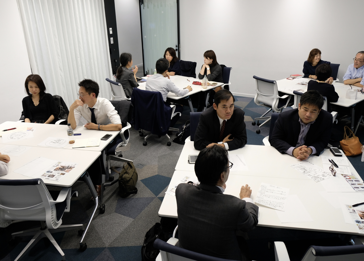 20分ほどかけてそれぞれのゴールデンサークルを作ったあとは、3~4人でのグループに分かれてシェアを行います。 自分ひとりで心に抱えていた「Why」「How」「What」を言語化して人に伝え、率直なシェアをもらう機会は非常に貴重なもの。丸の内プラチナ大学に集まる受講者は、目指す場所や思いは異なるもののパラレルキャリアやこれからの自分の未来に対して考える姿勢が前向きな人ばかり。何気ない言葉から、新しい可能性を見いだしたり、アドバイスを受けたりと、アイディアが広がっているようです。