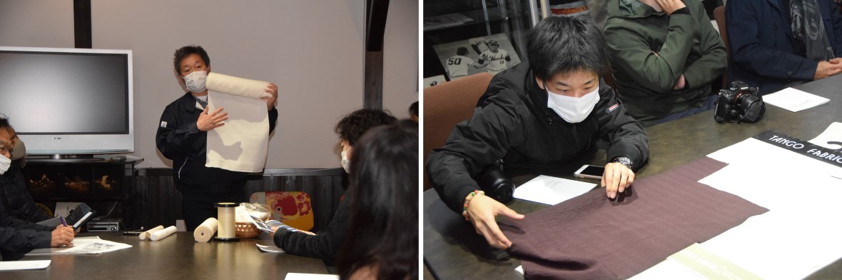 写真右:丹後ちりめんに興味を持っていた受講生は多く、皆熱心に説明を聞いていました