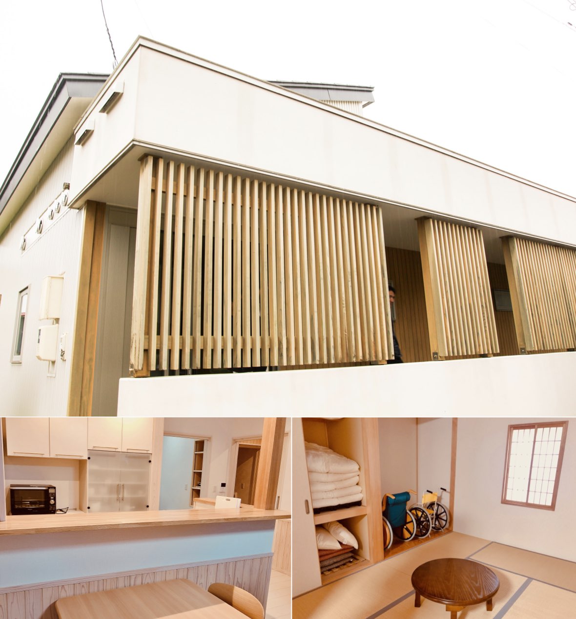 左下:ダイニングキッチン/右下:和室の一角には、室内用車いすなどの備品も完備している