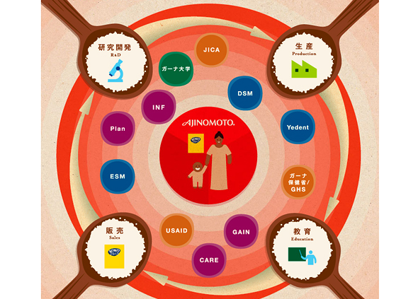 味の素ガーナ栄養改善プロジェクトには、これだけのセクターが関与している(味の素のサイトより)