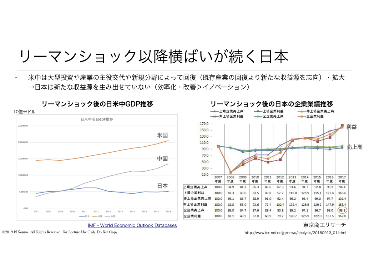リーマンショック後、大型投資や産業の主役交代、新規分野への拡大など既存産業の回復によって新たな収入源を生み出したアメリカと中国に対し、日本は、イノベーションよりも既存産業の効率化・改善にフォーカスしてきました。GDPの推移を比較すると、アメリカはリーマンショック後の約1.5~2倍、中国は2014年を境にアメリカを抜き去り、約2.5~3倍に増加した一方、日本はリーマンショックから11年経った今もなお、横ばいが続いています。「リーマンショック後の日本の企業業績推移(上記右グラフ)を見ると、2017年の全企業利益は、リーマンショック前の2007年の約1.6倍となっているが、2017年の全企業売上高は、むしろ減少していることが見て取れる」と紺野氏。