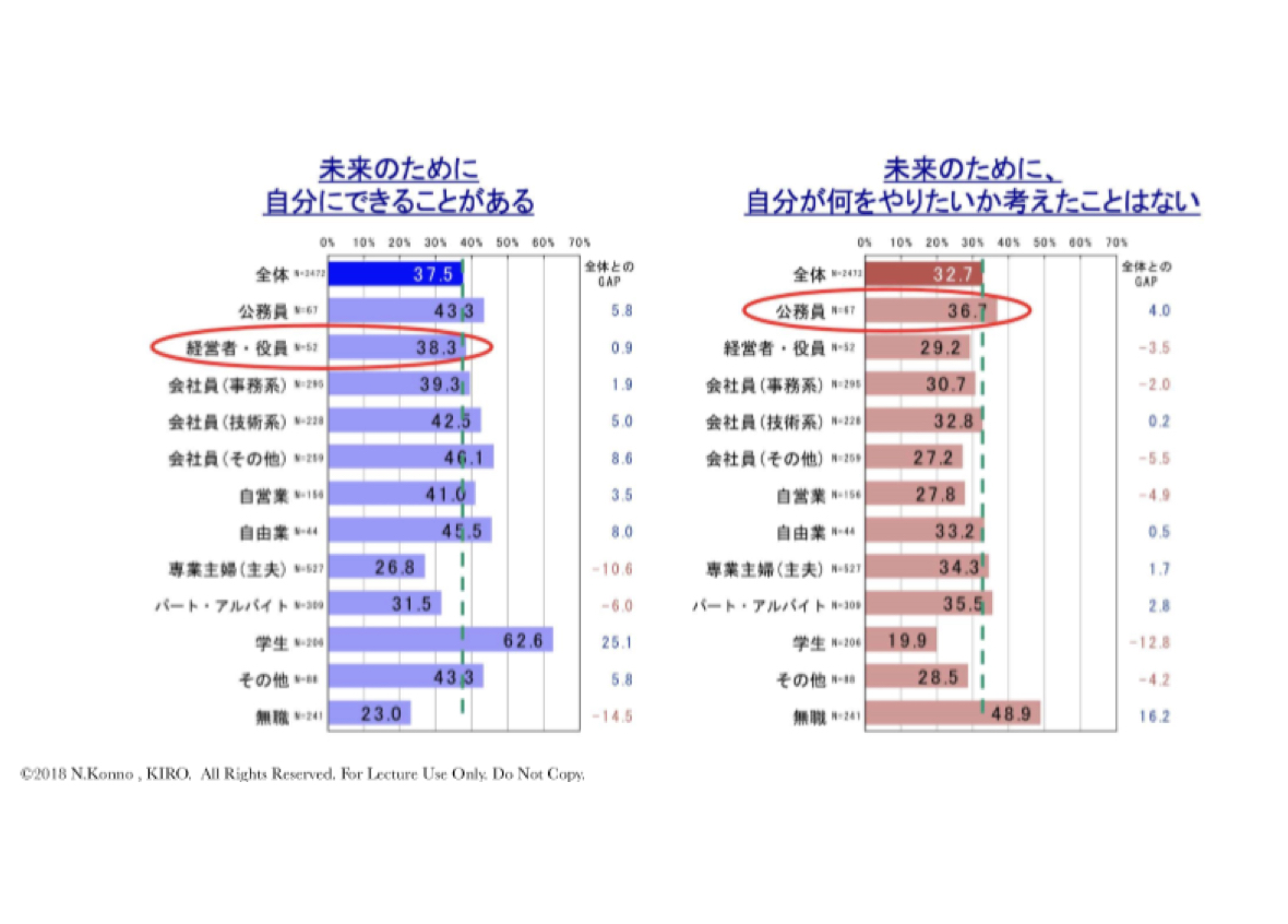 さらに、紺野氏が代表理事を務める一般社団法人Future Center Alliance Japan(FCAJ)の調査結果が共有されました。これによると、普段の暮らし向きに対して、全体の約56%が「ほぼ満足している」と回答したのに対し、「日本社会に対して満足している」と回答したのはわずか24%で、4人に3人が何らかの不満を持っていることが分かりました。また「未来のために自分にできることはある」と回答した人のうち、ダントツ高かったのは62.6%の学生で、経営者・役員は38.3%と平均よりはわずかに高いものの、有識者の中では最も反応が鈍く、「未来のために、自分が何をやりたいか考えたことはない」と回答した人では、36.7%の公務員の反応が高めでした。