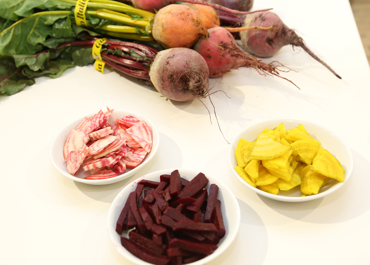 この後は、昨秋実際に出荷したビーツ3種類、カリーノ・ケール、カリフローレ、トレビスを、味や見た目、栄養価を中心に紹介。共通しているのは、ユニークな見た目(色、形)、そして栄養の豊富さ、そして何よりも日本人には馴染みのなかった、濃密な野菜のおいしさです。「美肌効果や免疫力アップ、抗酸化作用、高血圧に効果があるといった機能性や、高栄養価などの特徴があります。インスタ映えするような見た目もあるし、人に薦めたくなる野菜ではないでしょうか」。ビーツは比較的日本人にも知られた野菜ですが、それ以外は初見という参加者も多かったようです。これらの野菜は後半の試食会に提供されています。