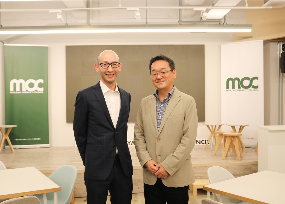 4代目の出向者、宮崎県職員の宮村駿氏(右)がこのインタビューに立ち会った。歴代の出向者は、密に交流しているという。