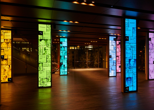 8本のモノリスがさまざまな映像コンテンツを映し出す(三井住友銀行提供)